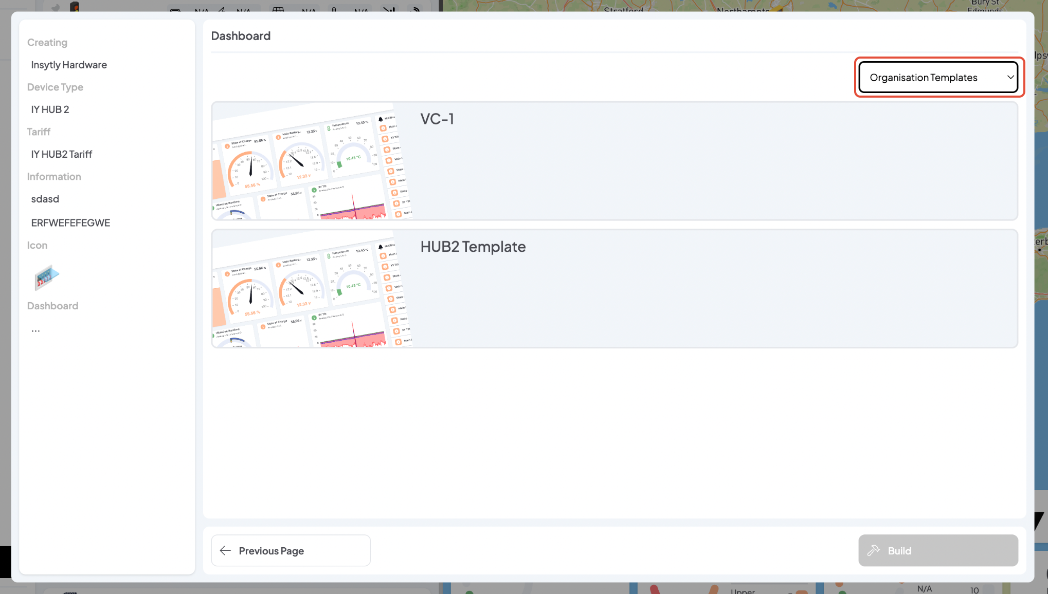 - When adding a new device, you will be given the option to select a template. The pre-made templates for your organisation will appear in the selection under "Organisation Templates" in the drop-down list to the right.