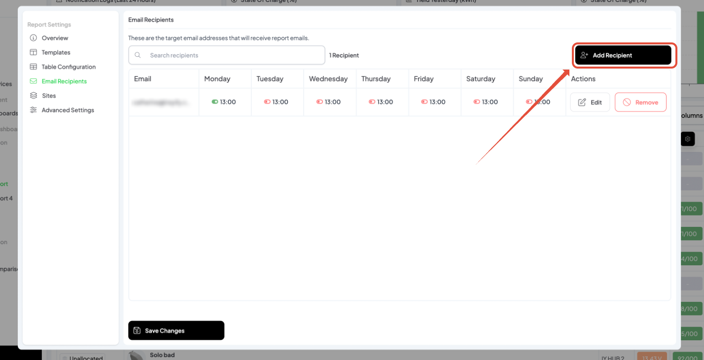 The recipient will now appear in the main "Email Recipients" table. You can repeat these steps to add multiple recipients, each with their own unique schedule.